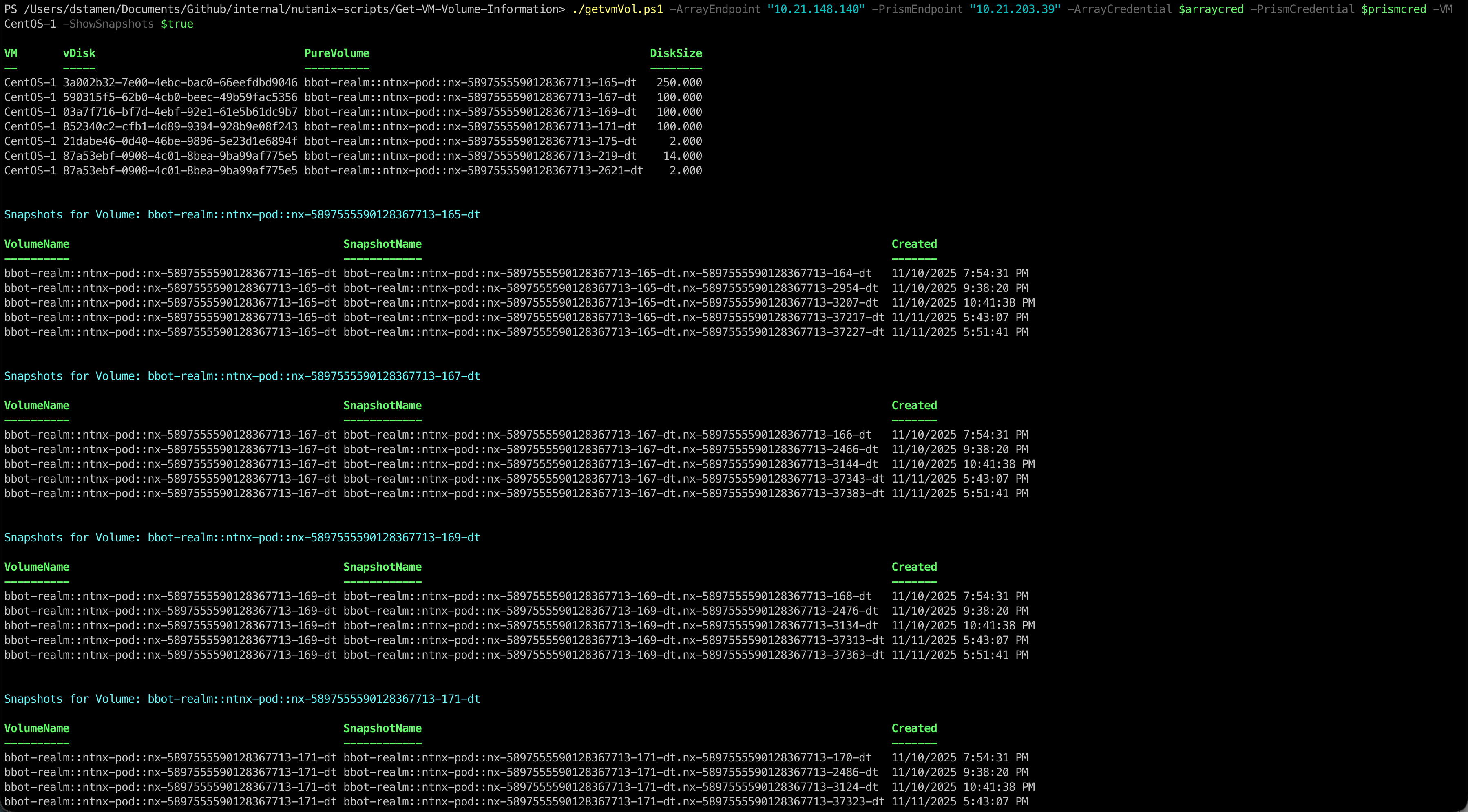 ./GetVMVol.ps1 -ArrayEndpoint $ArrayEndpoint -PrismEndpoint $PrismEndpoint -ArrayCredential $arraycred -PrismCredential $prismcred -showSnapshots $true